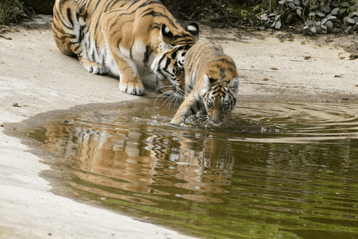 With a nudge from mum, Yana, one of the four Amur tiger cubs takes a dip in the pond while another studies her reflection in the water in these images captured by keeper Ian Turner.