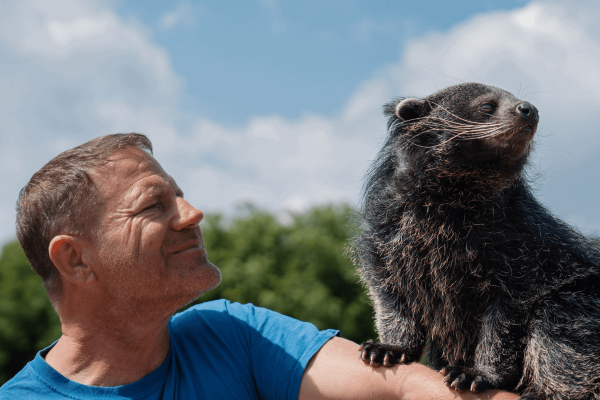 A rare binturong decided to get up close with the legendary naturalist Steve Backshall and use him as a climbing frame.