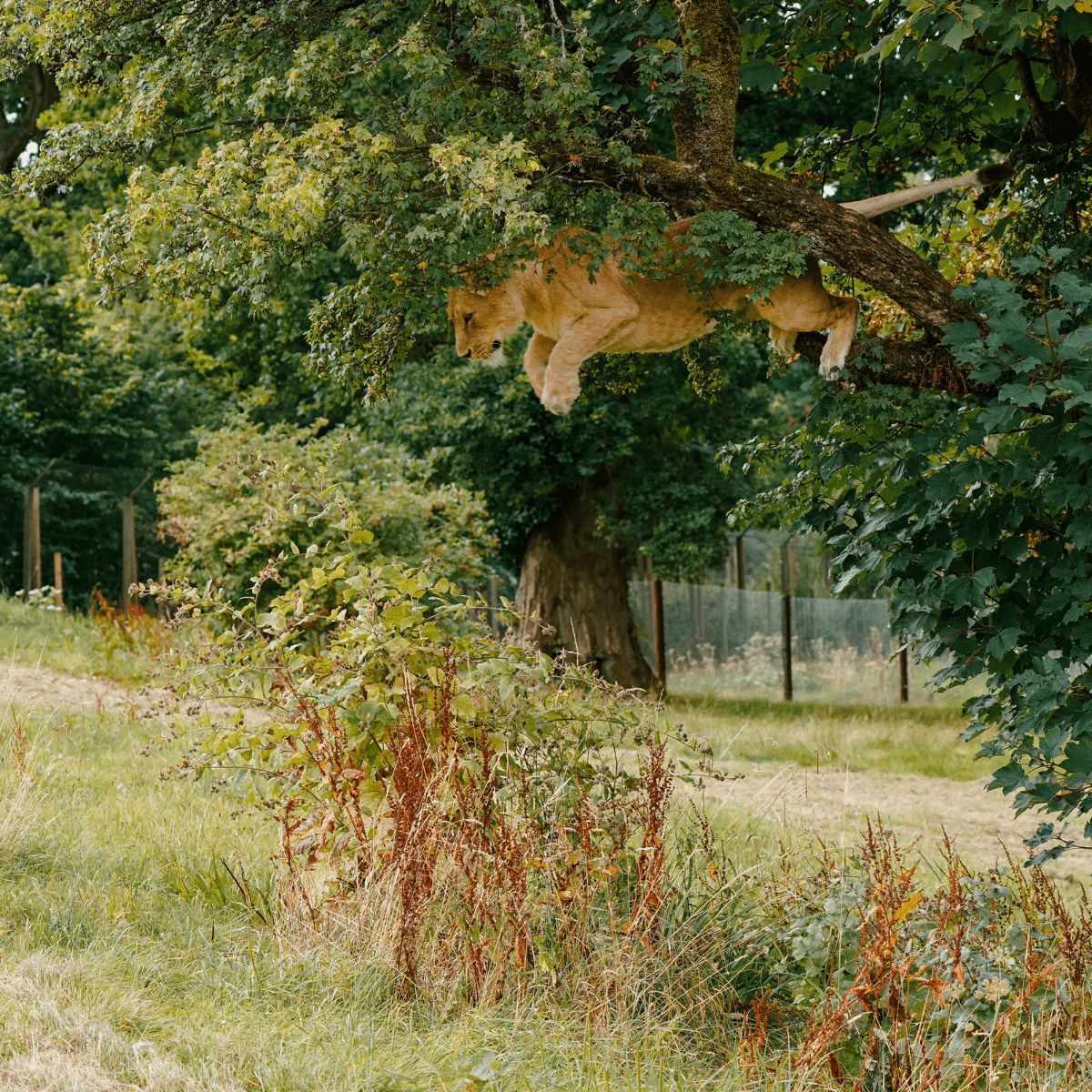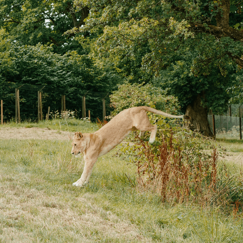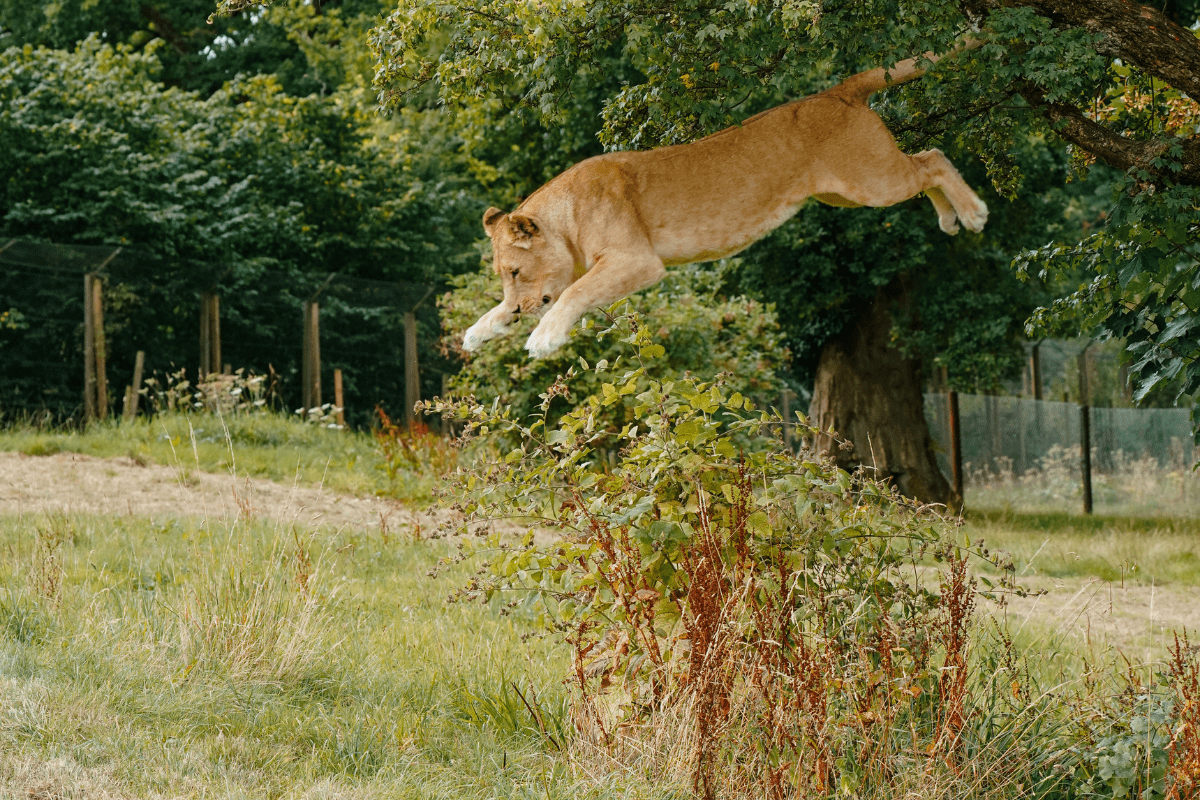 Beryl is one of Harry’s pride and the photographs show her rippling muscles as she pauses to jump, and then mid-flight before landing safely on the ground, several feet below the branch. Beryl is nearly 12 and was born at Longleat.