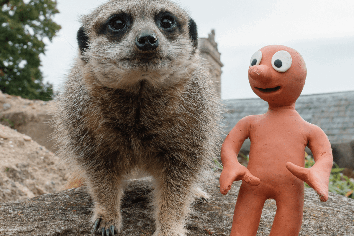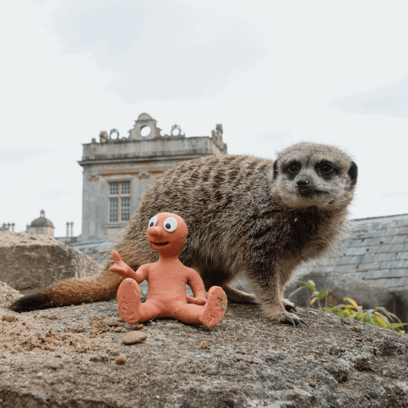 Morph can be seen in front of Longleat House, excitedly presenting the Elizabethan Stately home, helping paint lanterns and feeding the meerkats.